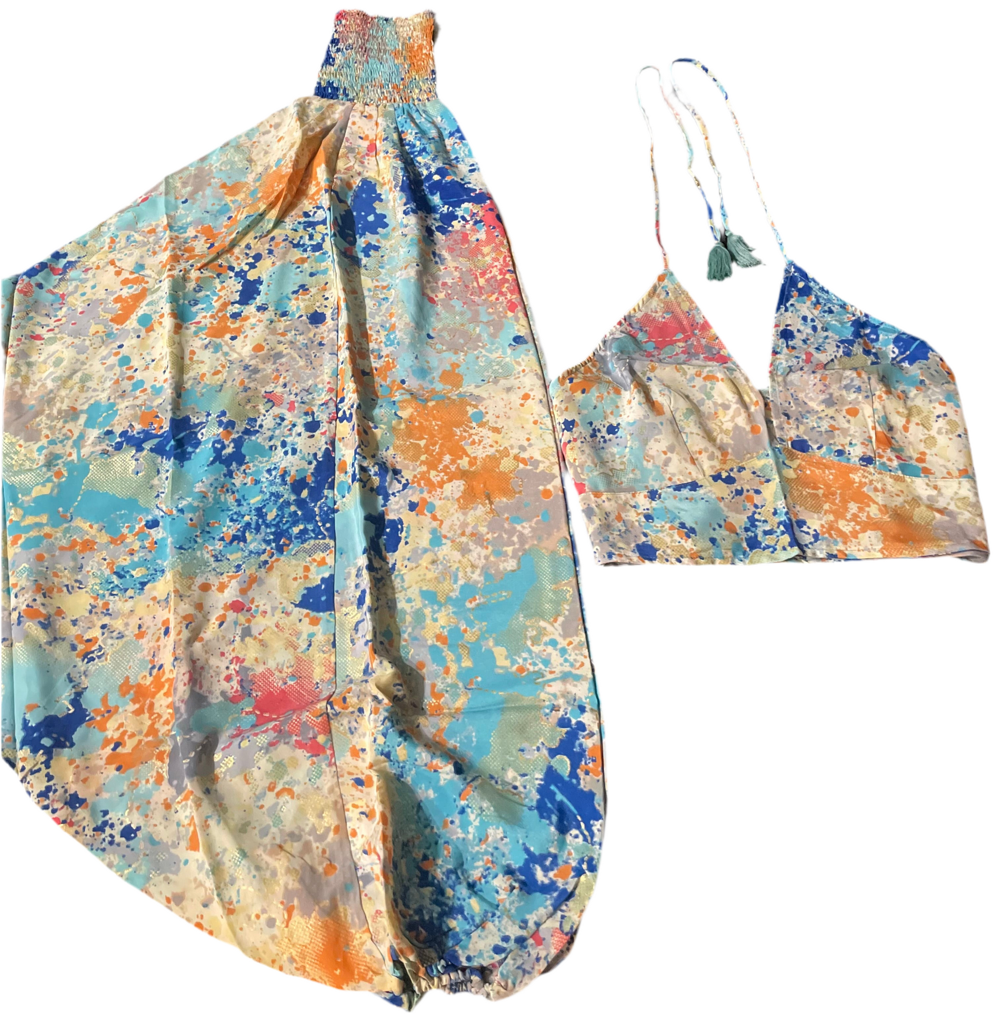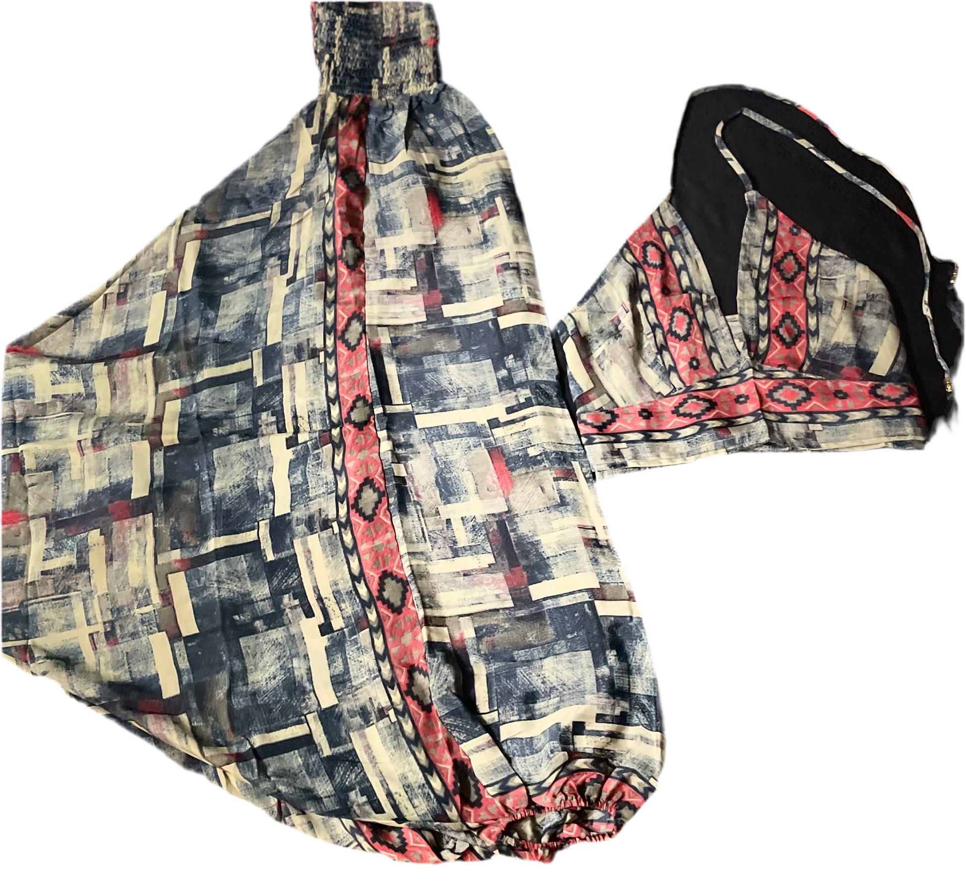These boho-inspired harem pants and bikini tops blend luxurious comfort with effortless style. Crafted from a premium 70% silk and 30% viscose fabric, they offer a soft, breathable feel ideal for warm weather. Designed to fit up to size Large, this versatile set ensures a flattering silhouette for various body types. For lasting quality, wash cold and hang dry to preserve the fabric’s delicate texture and vibrant colors. Perfect for relaxed days or beach outings, this outfit combines expert craftsmanship with bohemian flair.